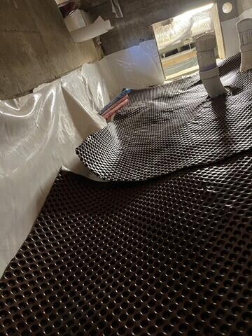 The property owner contacted Olympic Restoration Systems due to a leak in the parking garage that could not be contained or remedied. We sent one of our System Designs Specialists, Terry, to the property for a free basement waterproofing inspection and estimate. The property owner accepted the solution that Terry offered and proceeded with basement waterproofing from Olympic Restoration Systems. Our Production Team set up containment around the workspace to prevent the spread of harmful materials. They also set up a HEPA vacuum to scrub any contaminants out of the air. Next, they removed the necessary floor tiles to complete the work. They then prepped the basement walls and sealed them with PermaFlex.